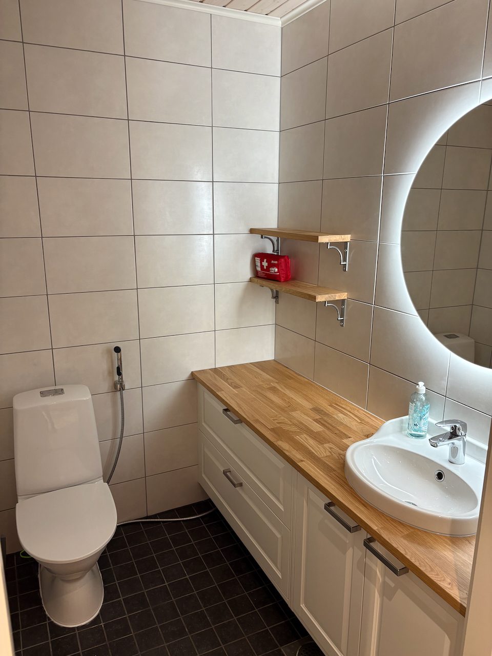Saunottelemaan mahtuu kerralla 4-6 aikuista ja kylpyhuoneessa on kaksi suihkua. Oleskelutilassa on “huoltopiste” eli pyykinpesukone ja kuivausrumpu. WC ja varastohuone löytyvät keittiön vierestä.
